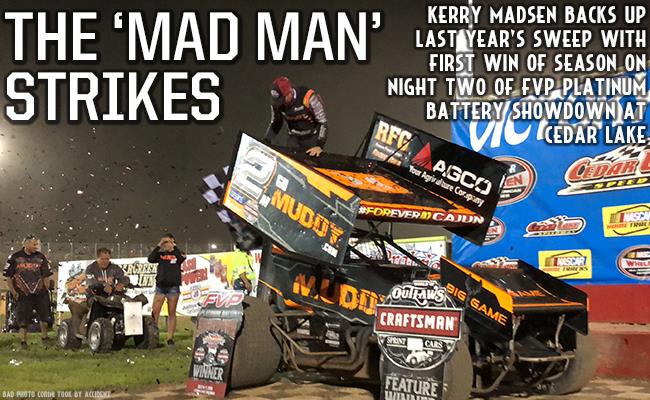 NEW RICHMOND, WI – July 7, 2018 – Kerry Madsen, who swept both nights of last year’s FVP Platinum Battery Showdown at Cedar Lake Speedway, got the monkey off his back with his first World of Outlaws Craftsman Sprint Car Series victory of 2018. In a 41-lap Feature in honor of Jason Johnson’s birthday, Madsen passed Brad Sweet on Lap 38 in an exciting race. Sweet settled for second with Donny Schatz completing the podium.